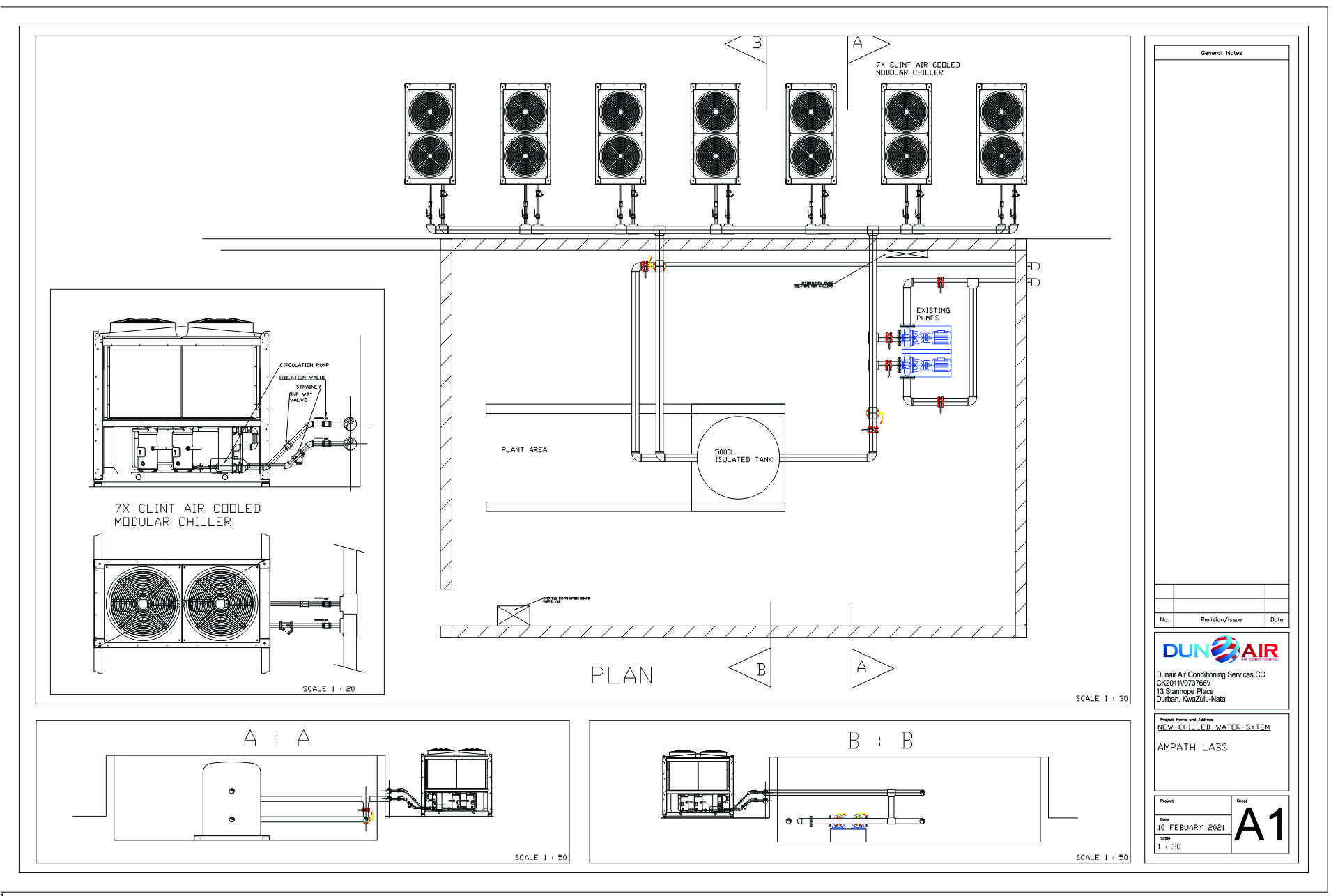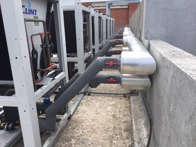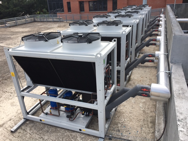 solution was to use 7 Air Cooled chillers, linked to buffer tank which feeds